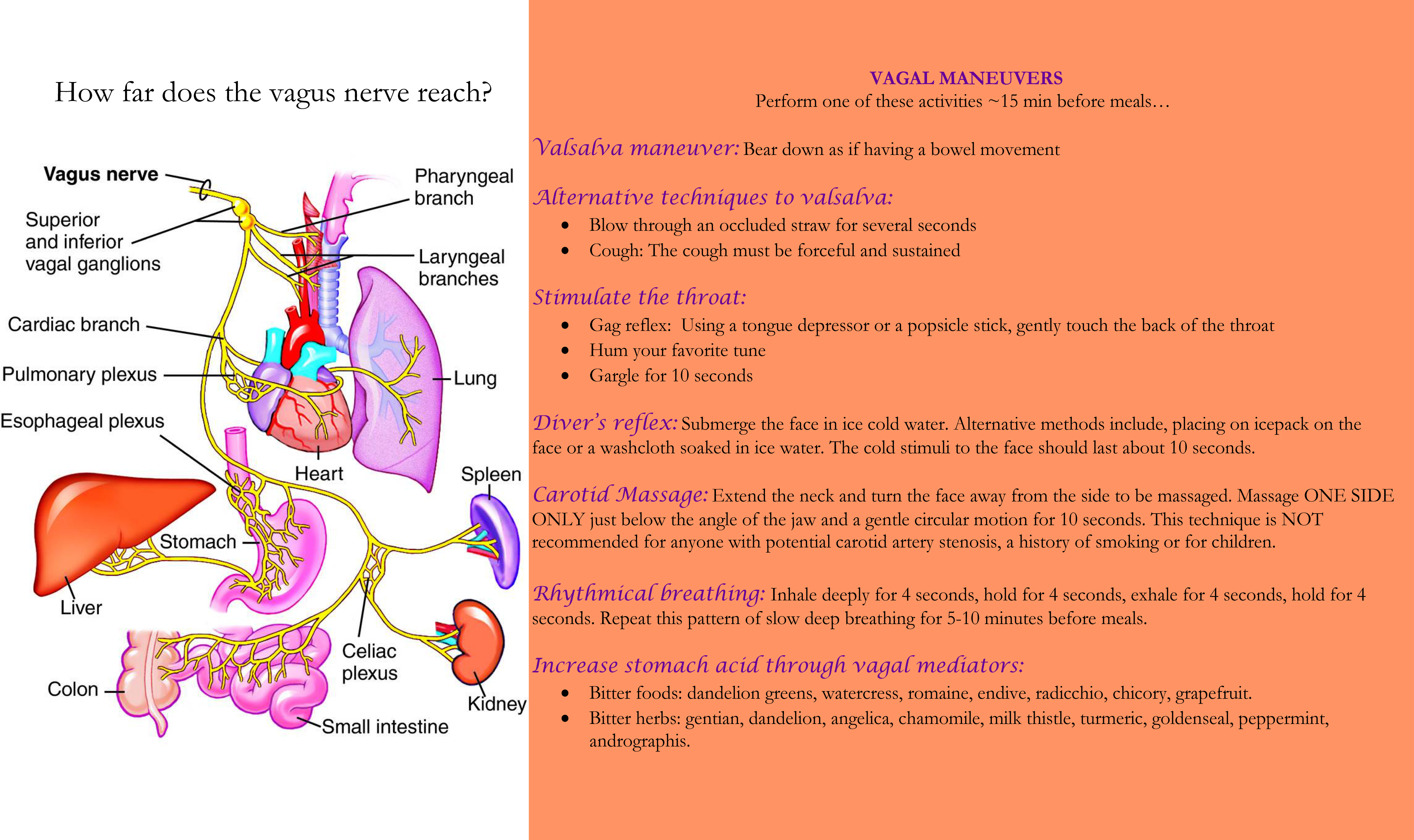 For those of you who suffer from bloating, gas, nausea and abnormal bowel movements, these techniques can be employed before meals to stimulate the vagus nerve. As part of your 4R program, they will enhance stomach acid, bile and enzyme secretion as well as the rhythmic contractions to propel the food forward.