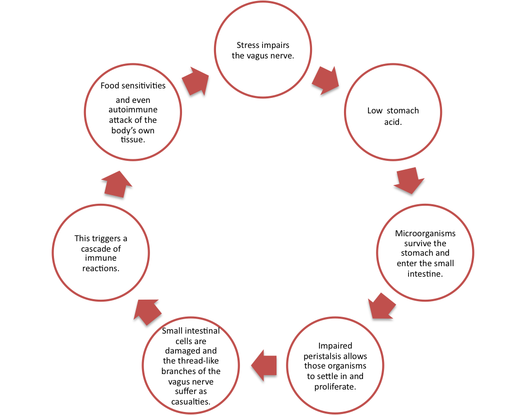 The vagus nerve can also be damaged by physical stressors, including, an episode of food poisoning, chronic gut infections and mononucleosis. Regardless of the triggering event, the consequences of vagal imbalance generate a vicious cycle of damage in the gut.
